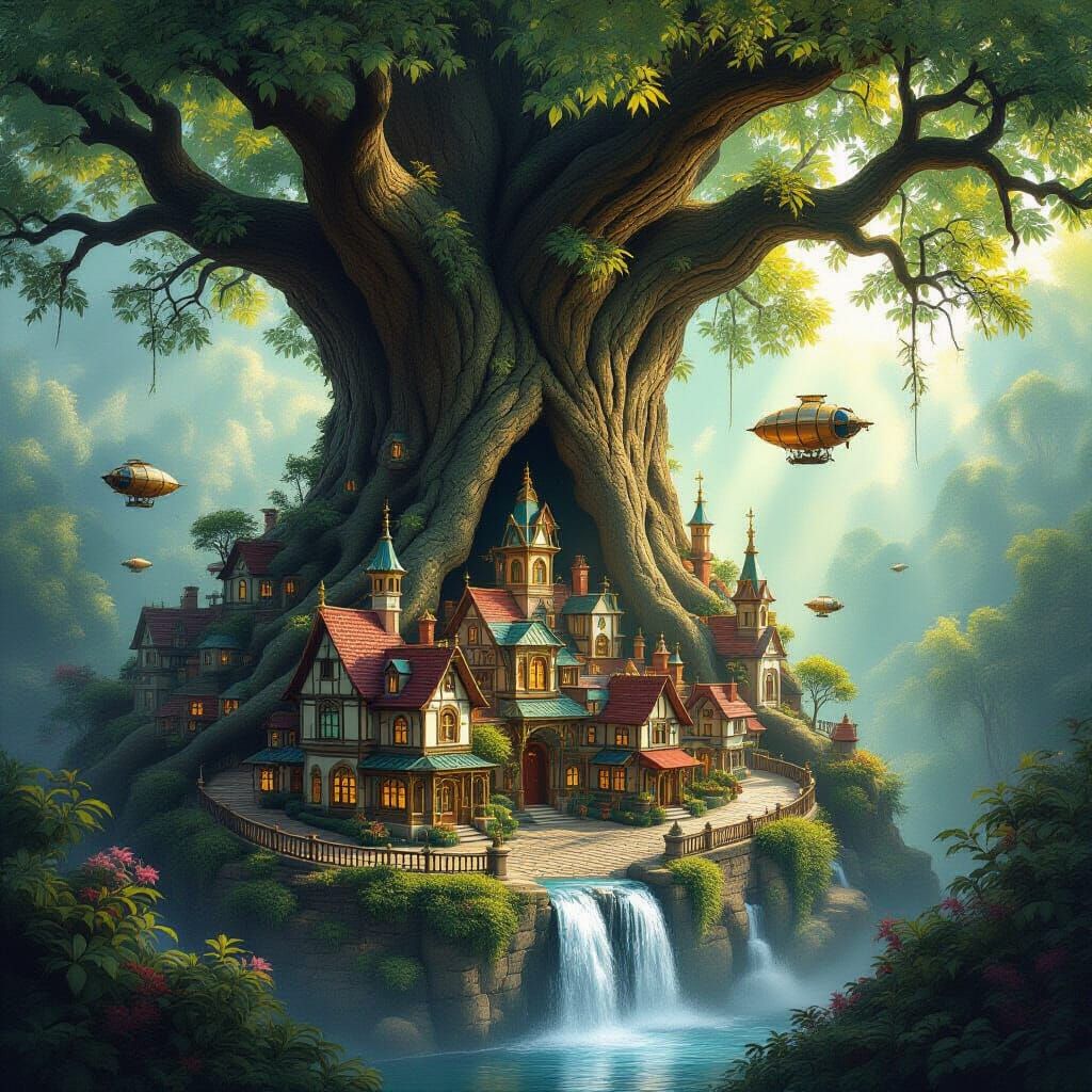 This image depicts a miniature Victorian city within a giant tree, featuring airships and a waterfall. Rendered in a soft, painterly style with warm colors and diffused light for a magical feel.