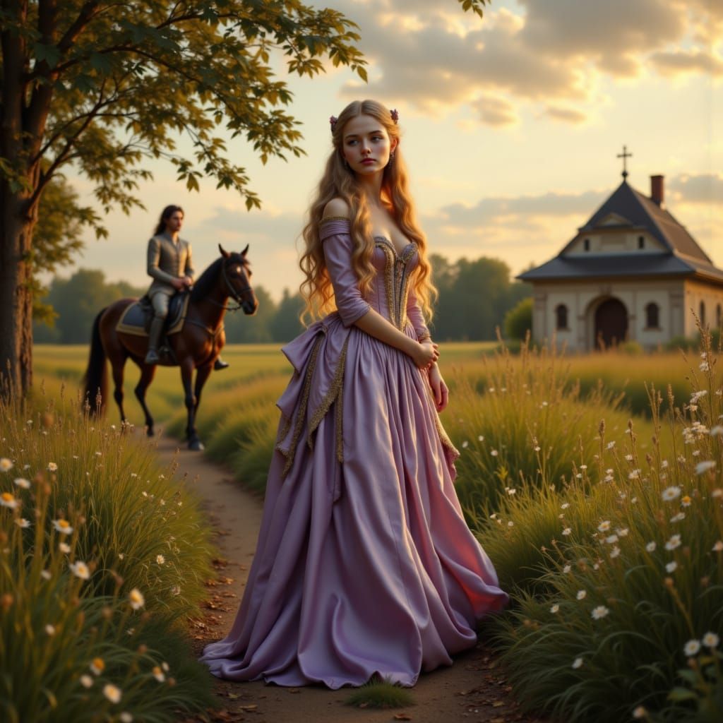 This image features a 16-year-old girl with long blonde hair in a Baroque violet dress. The scene is set in a meadow with dramatic volumetric lighting and golden hour hues, rendered in a photorealistic style.