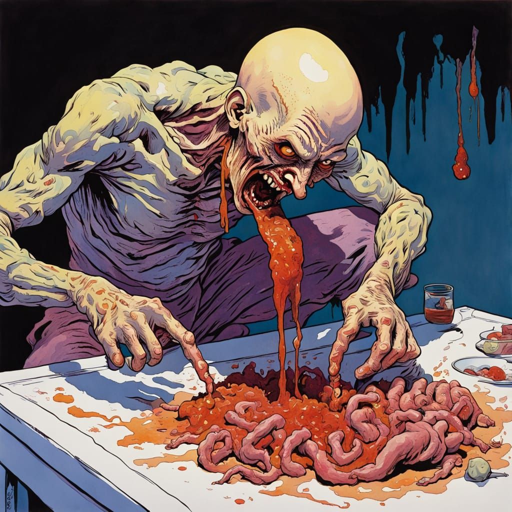 A ghoul expels maggots and blood, rendered in a bright retro comic book style with gouache and watercolor effects, featuring volumetric lighting.