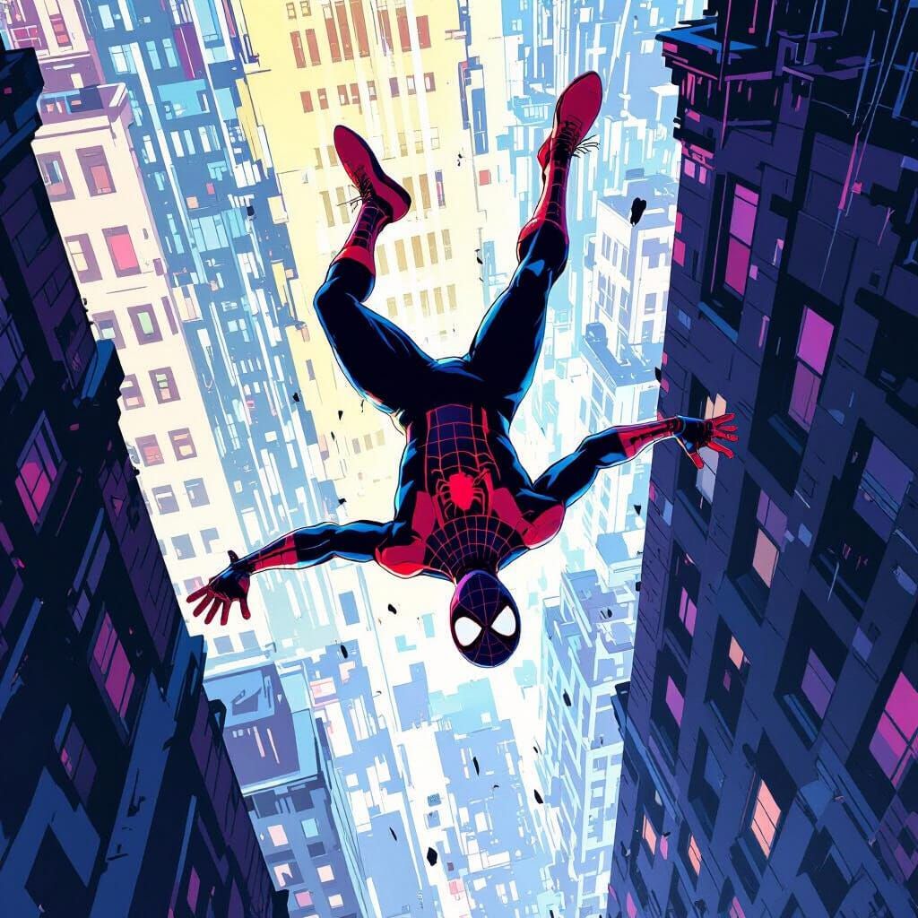 This image depicts Spider-Man in a dynamic fall from a building, rendered in a vibrant comic book aesthetic with striking neon blues and purples.