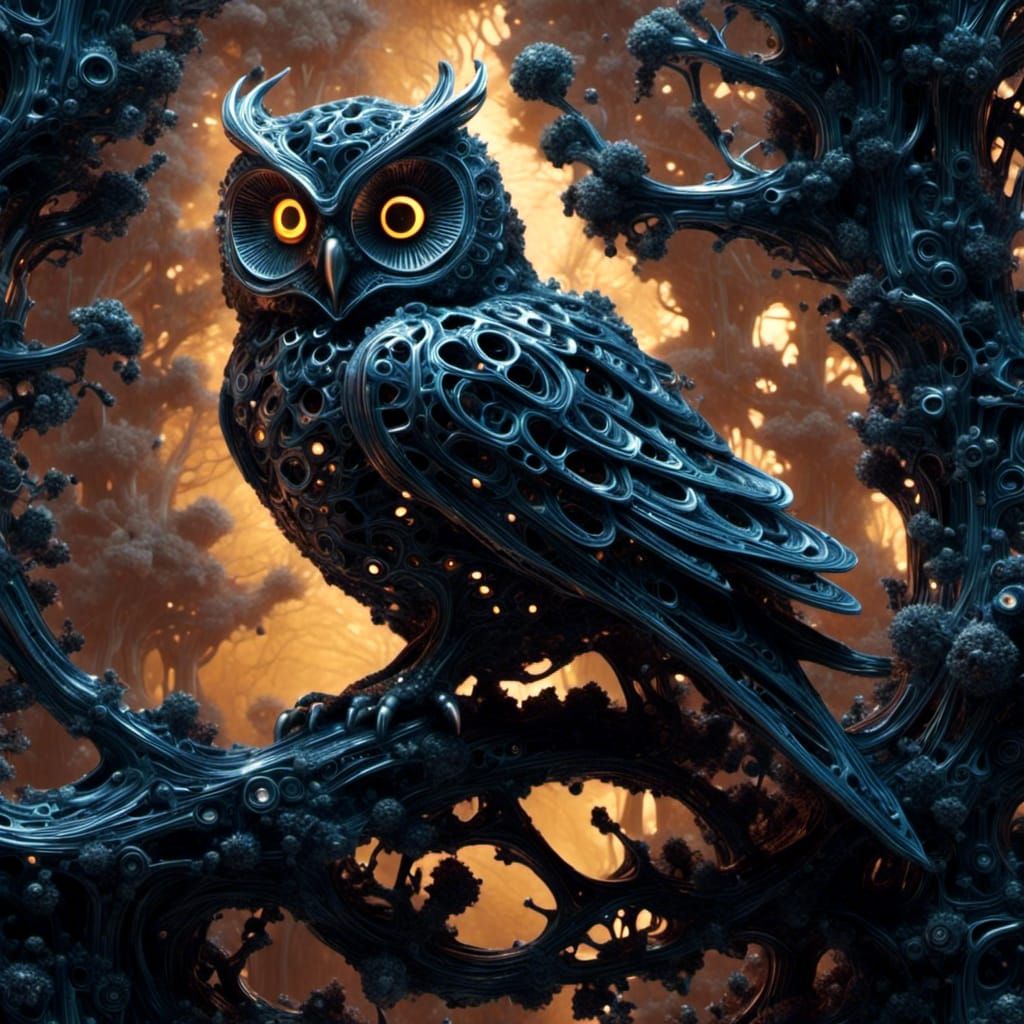 This image shows a formidable stone owl, intricately carved as a 3D mesh array. Neon lights glow from within the organic structure in a biomechanical and gothic style.