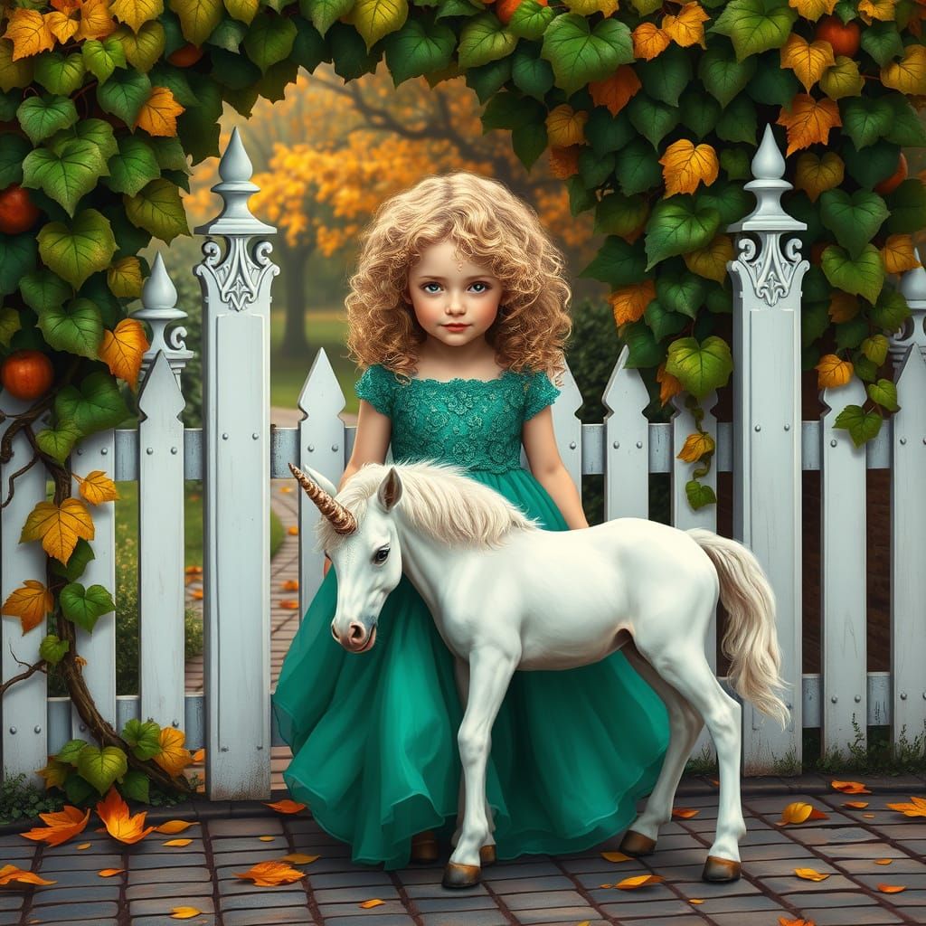 This enchanting scene depicts a young girl with curly blonde hair and a green dress, standing behind a picket fence amidst a vibrant autumnal backdrop, surrounded by a baby unicorn and lush grapevine. The warm light casts a gentle glow, inviting the viewer to step into this serene and idyllic world.
