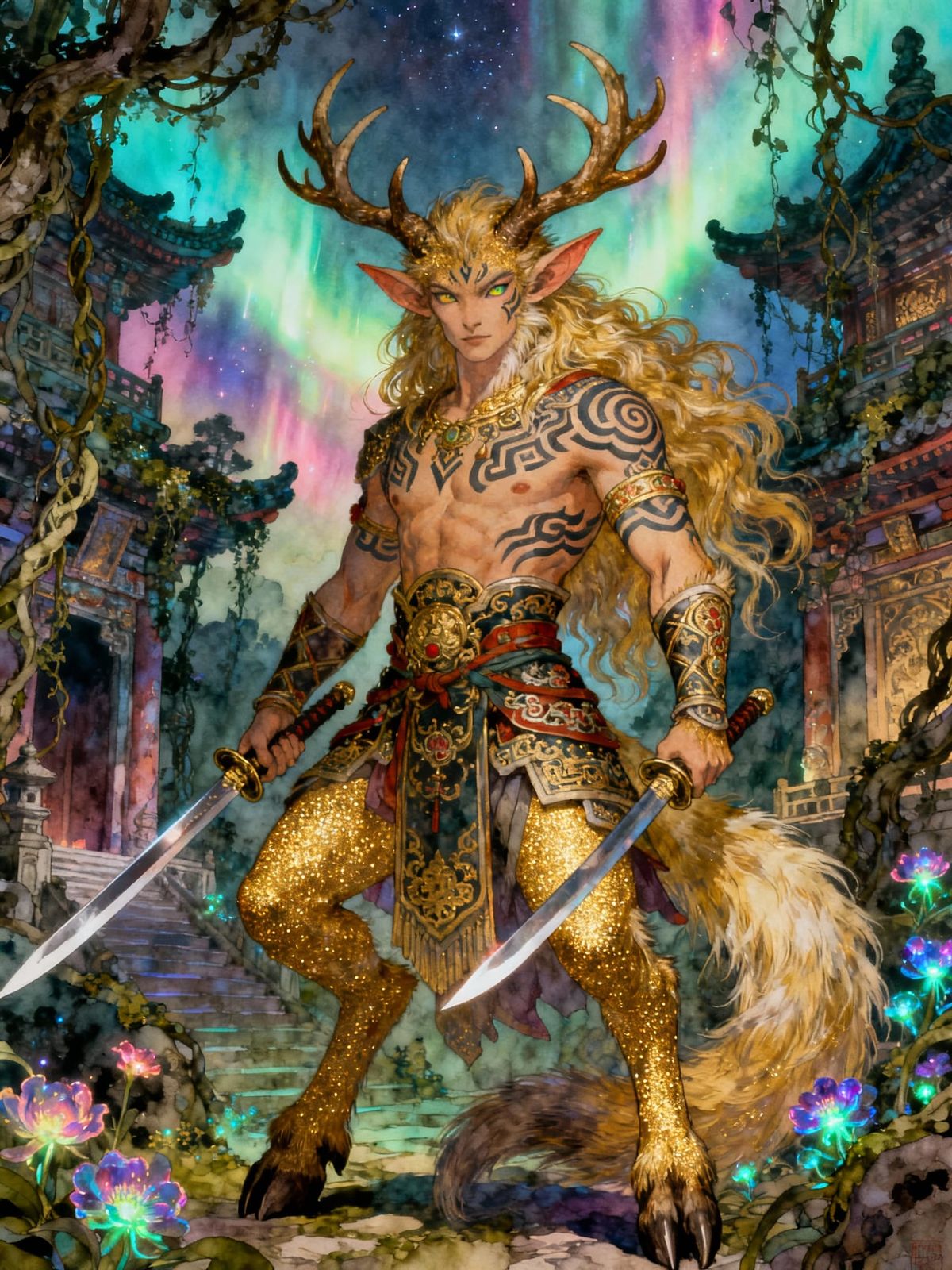 A striking image of a muscular, charismatic fantasy creature in ornate armor, posed provocatively in a mystical temple. Features watercolor and ink style with ethereal lighting.
