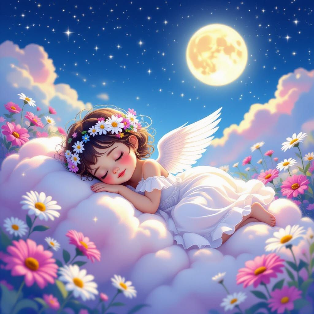 This image shows a baby angel asleep on a cloud under a starry sky. The digital illustration is full of colorful flowers and has a dreamy, magical atmosphere.