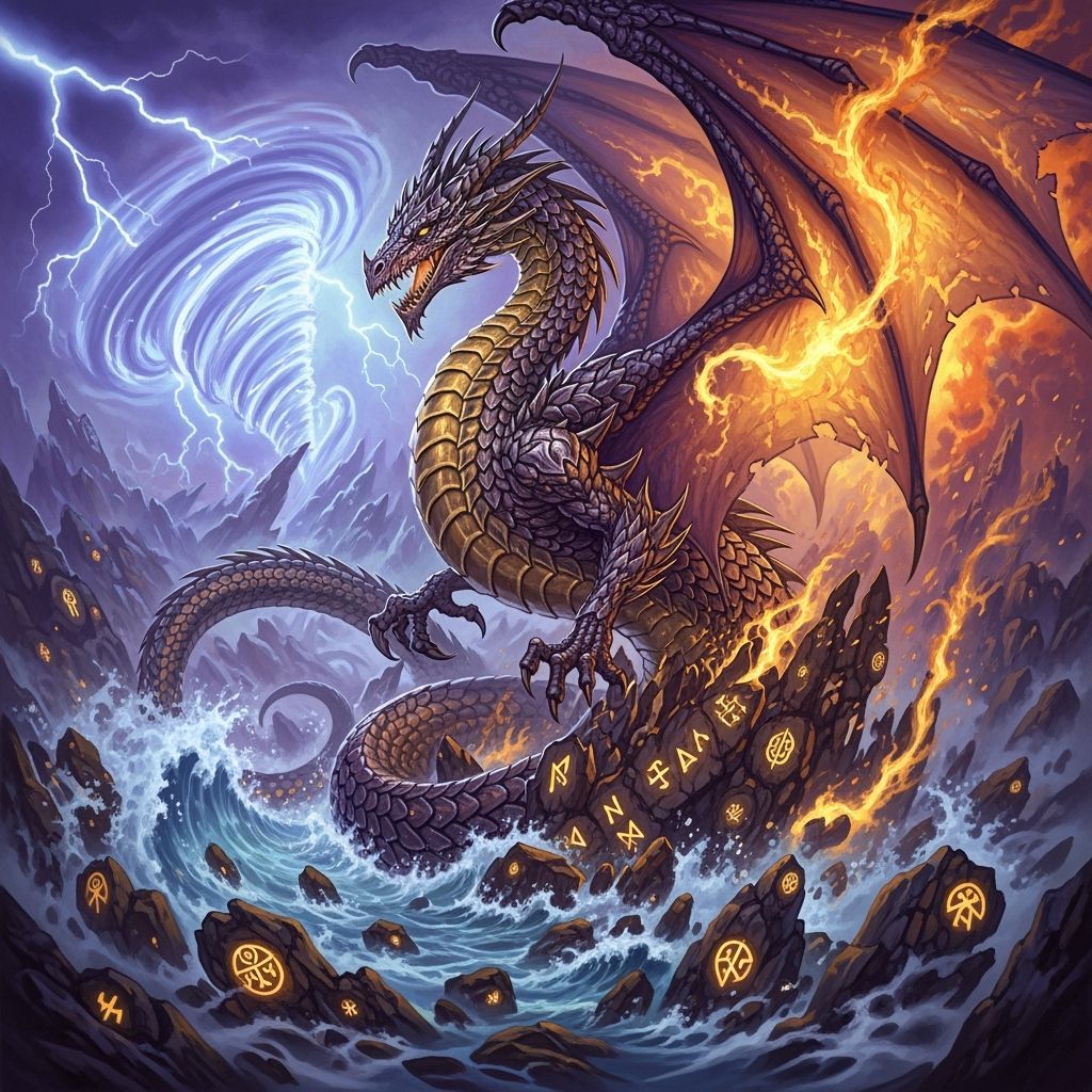 This image shows a majestic dragon with metallic scales surrounded by swirling elements. Earthy terrain rises from water, turbulent air manifests as cyclones, and fire erupts in tendrils. The dramatic lighting and detailed textures create an otherworldly glow.