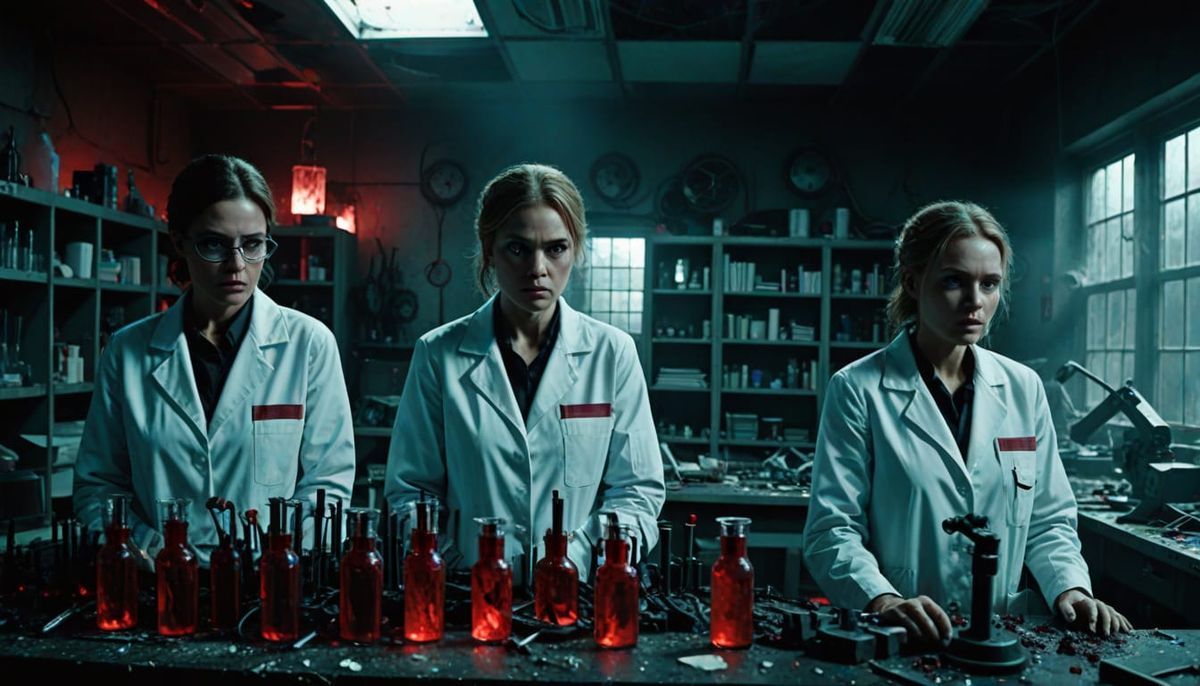 This image shows a destroyed laboratory filled with blood and broken equipment. Scientists in lab coats are visible in a medium shot. The Red Queen's glowing red eyes pierce the darkness in this bioorganic horror art.