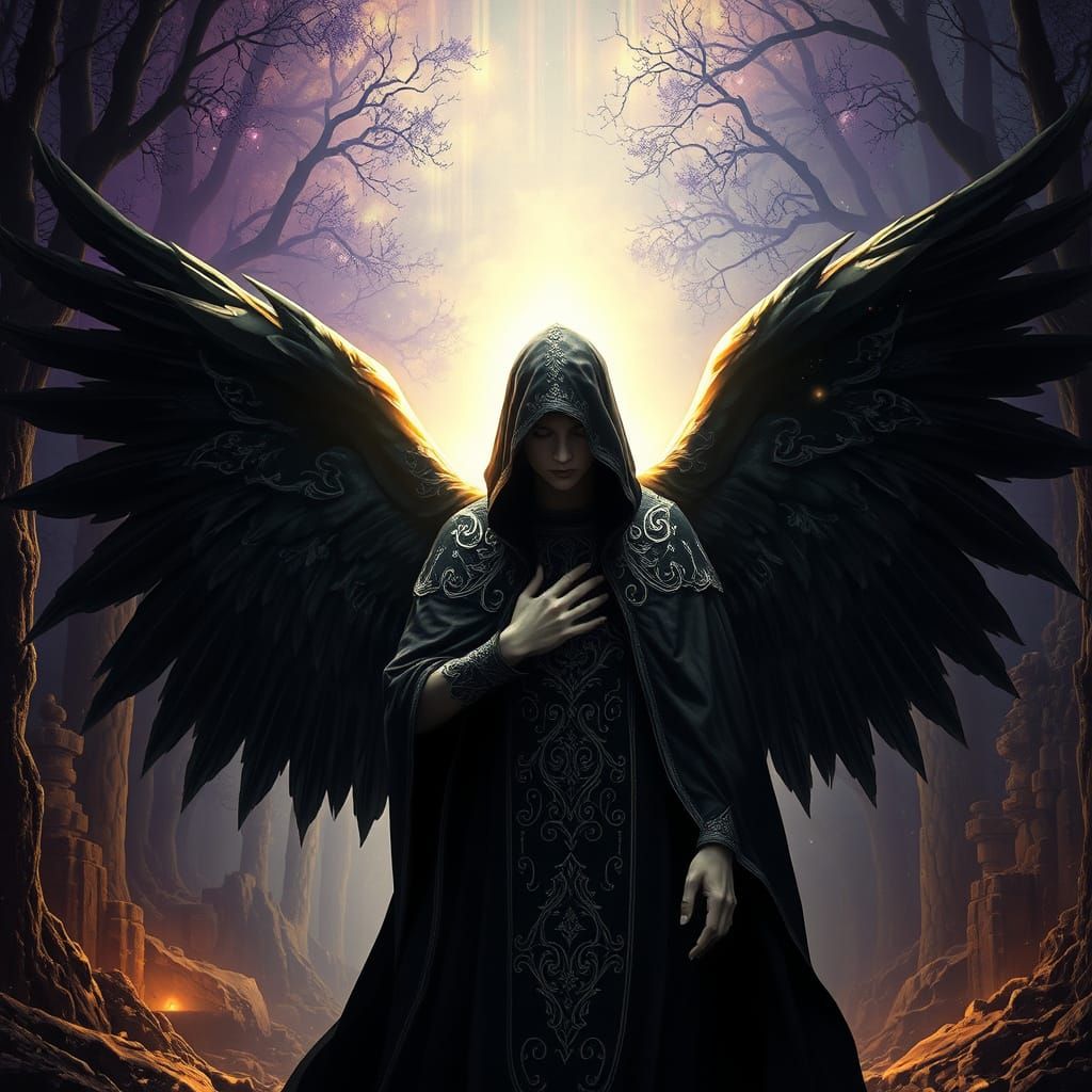 This image depicts a majestic angel in a dark fantasy realm, surrounded by ancient trees and mystical ruins, with intricate silver embroidery and delicate dark wings. The angel's union with the Angel of Death is shrouded in a mystical atmosphere, with dynamic lighting and rich textures, evoking a sense o...