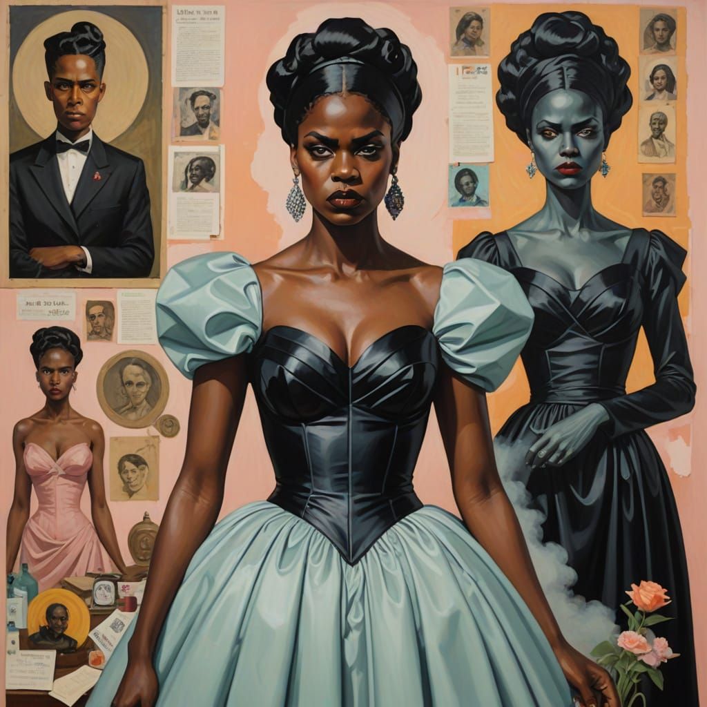 This image shows a menacing woman in a gown, set against a Dadaist background filled with anti-war symbols. The artwork features soft lighting and a pastel color scheme, rendered with graphic, airbrushed elements.