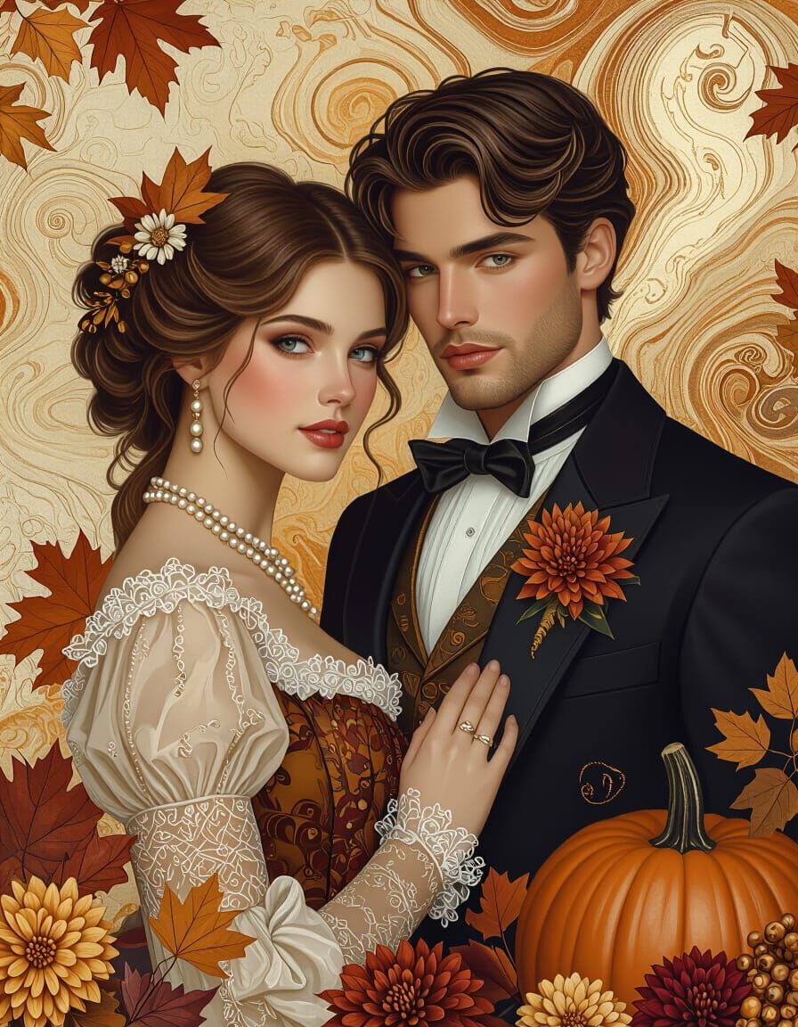 This image showcases a couple from the 1890s against a marbled autumn background. Elements like falling leaves, mums, pumpkins, and delicate gold lace create a rich, detailed scene in deep, complementary colors.