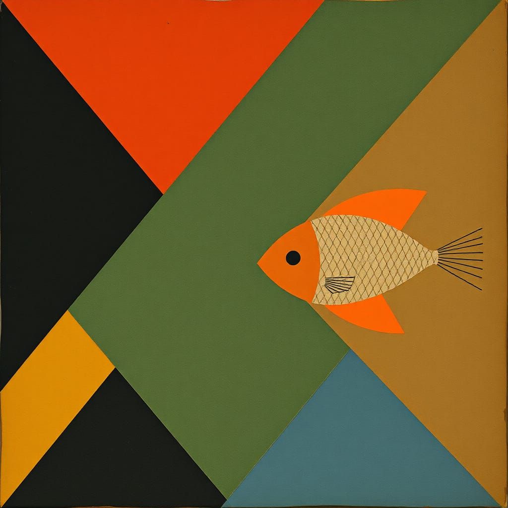 This image depicts abstract rhombic fish reminiscent of early 20th-century art. The composition evokes color field painting and surrealist styles.