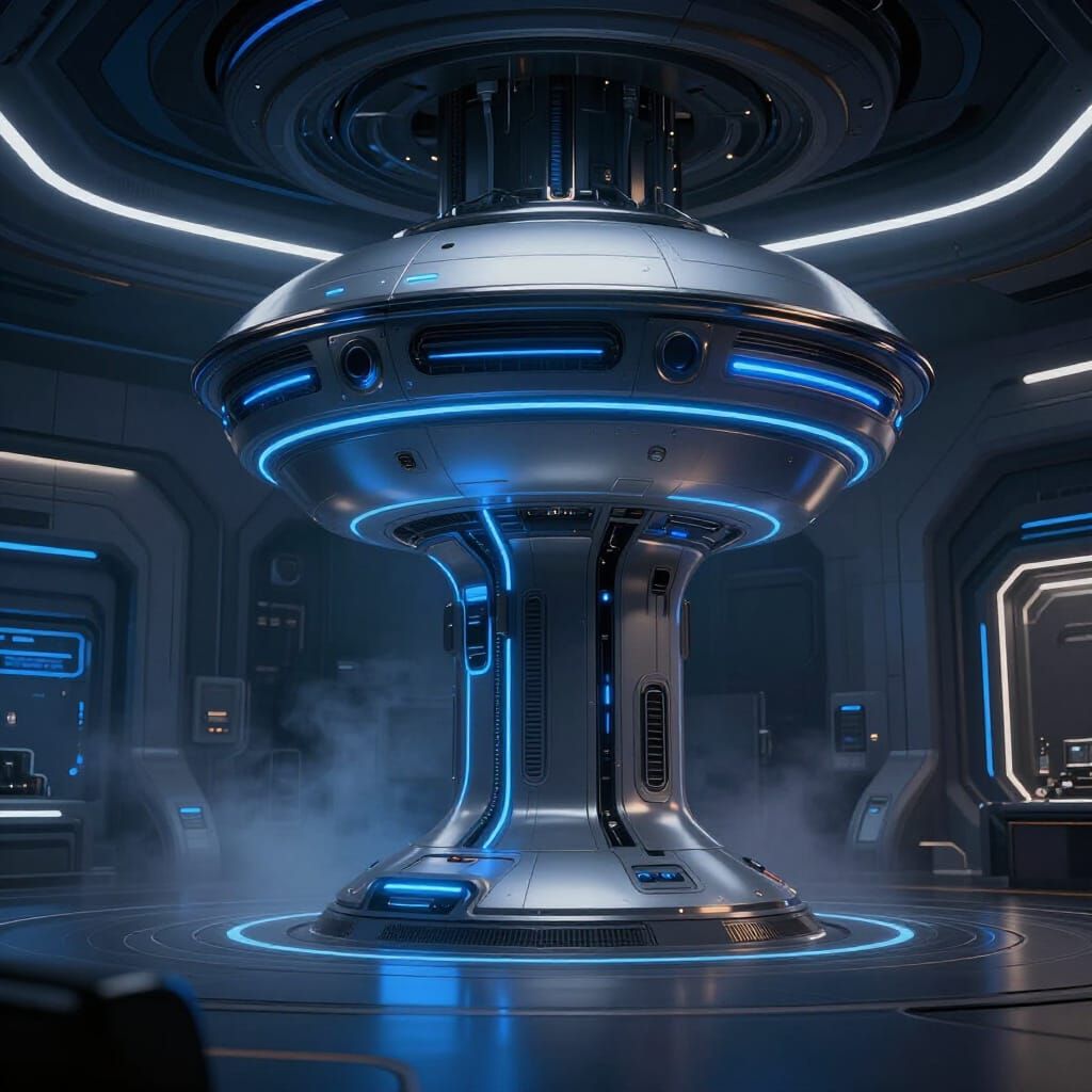 This image depicts a highly detailed futuristic room with clean lines and glowing blue accents. A turret with metallic textures and intricate panels is featured, rendered in a dramatic, high-contrast cinematic style.