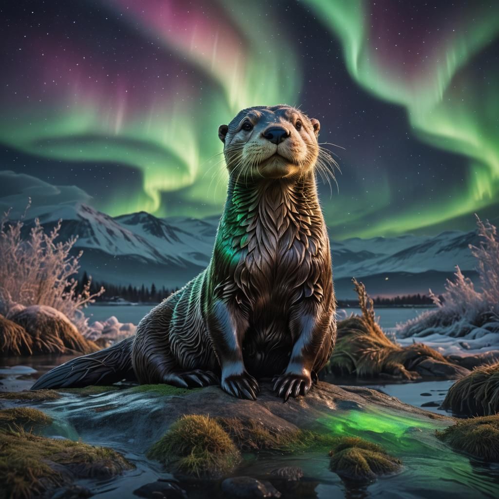 This image shows an otter composed of the vibrant colors of the aurora borealis. The artwork features intricate details, a sharp focus, and a cinematic quality in a hyperrealistic style.