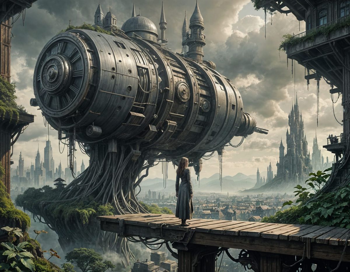 This image depicts a solitary woman with ethereal hair on a wooden platform, looking at a vast, melancholic futuristic city. Nature overtakes the architecture, with clockwork elements hinting at forgotten technology. Rendered as a detailed matte painting.