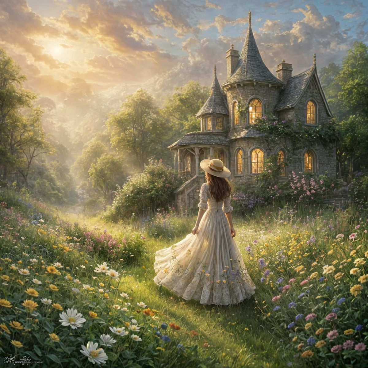 This image shows a young woman in a meadow wearing a hat made of flowers and vines. Golden hour sunlight illuminates the scene with a soft, painterly, and ethereal fantasy style.
