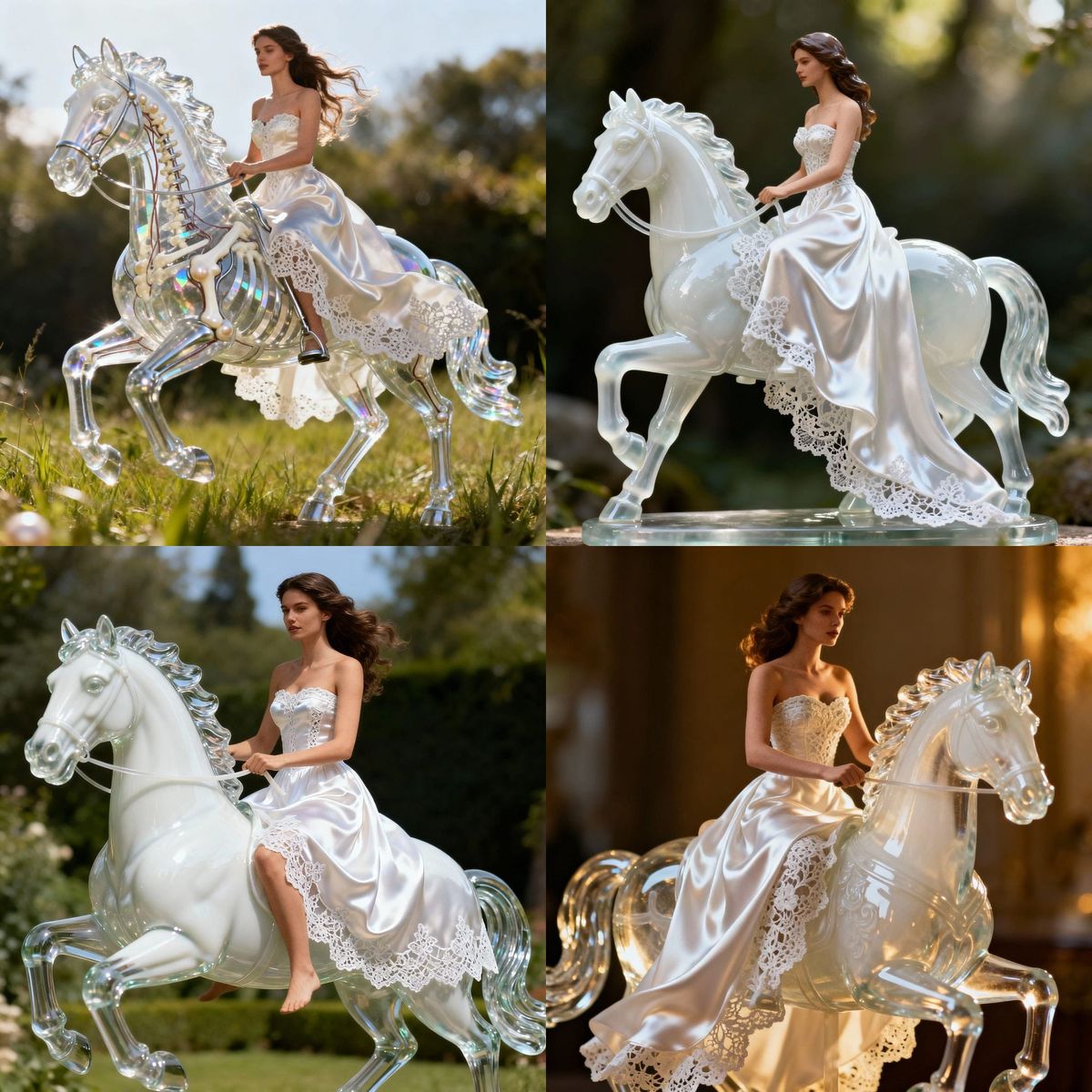 This hyperrealistic image captures a stunning woman in a white silk dress gracefully riding a detailed glass and ceramic horse, showcasing intricate artistry.