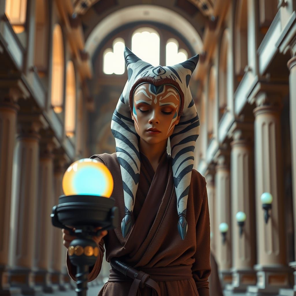 This image shows Ahsoka Tano in Jedi robes meditating next to a levitating orb. Sunlight streams into the Jedi temple with a bokeh effect, in a professional photographic style.