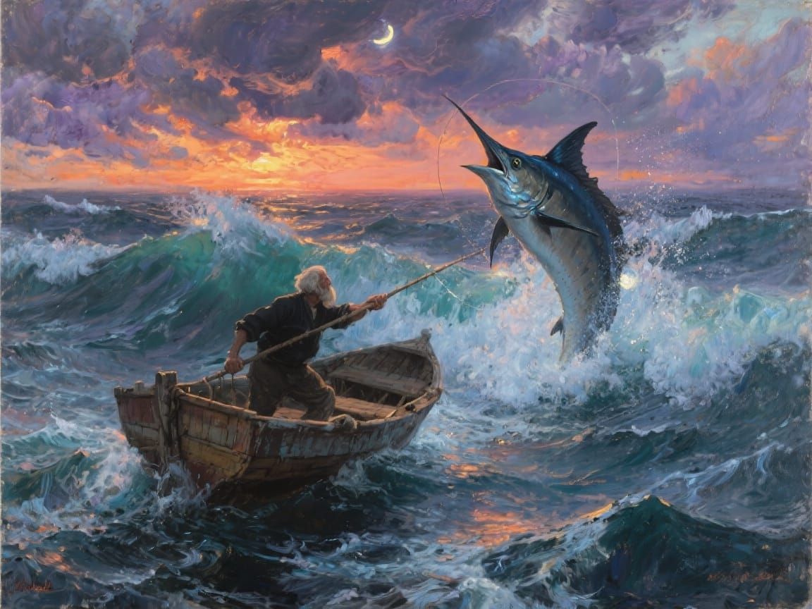 A vibrant seascape captures a lone fisherman's battle with a giant marlin. The turbulent ocean and dramatic sunset evoke a sense of awe and the timeless struggle of man against nature. Rendered as an oil painting with rich colors.
