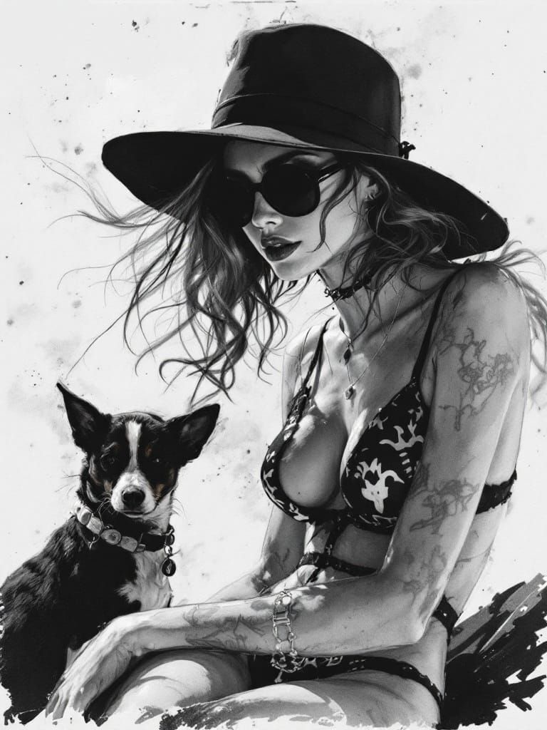 This image features a dog on a beach, rendered in a dynamic charcoal sketch style. It combines elegant linework, soft shading, and retro flair for a modern, cinematic feel.