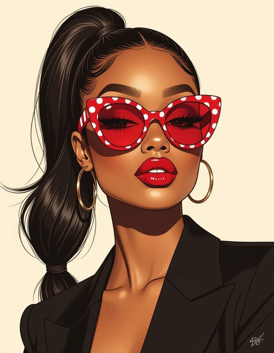 A striking picture of a young black woman with a ponytail wearing red sunglasses and a black blazer. The hyperdetailed charcoal drawing has vibrant textures and an expressive aesthetic.