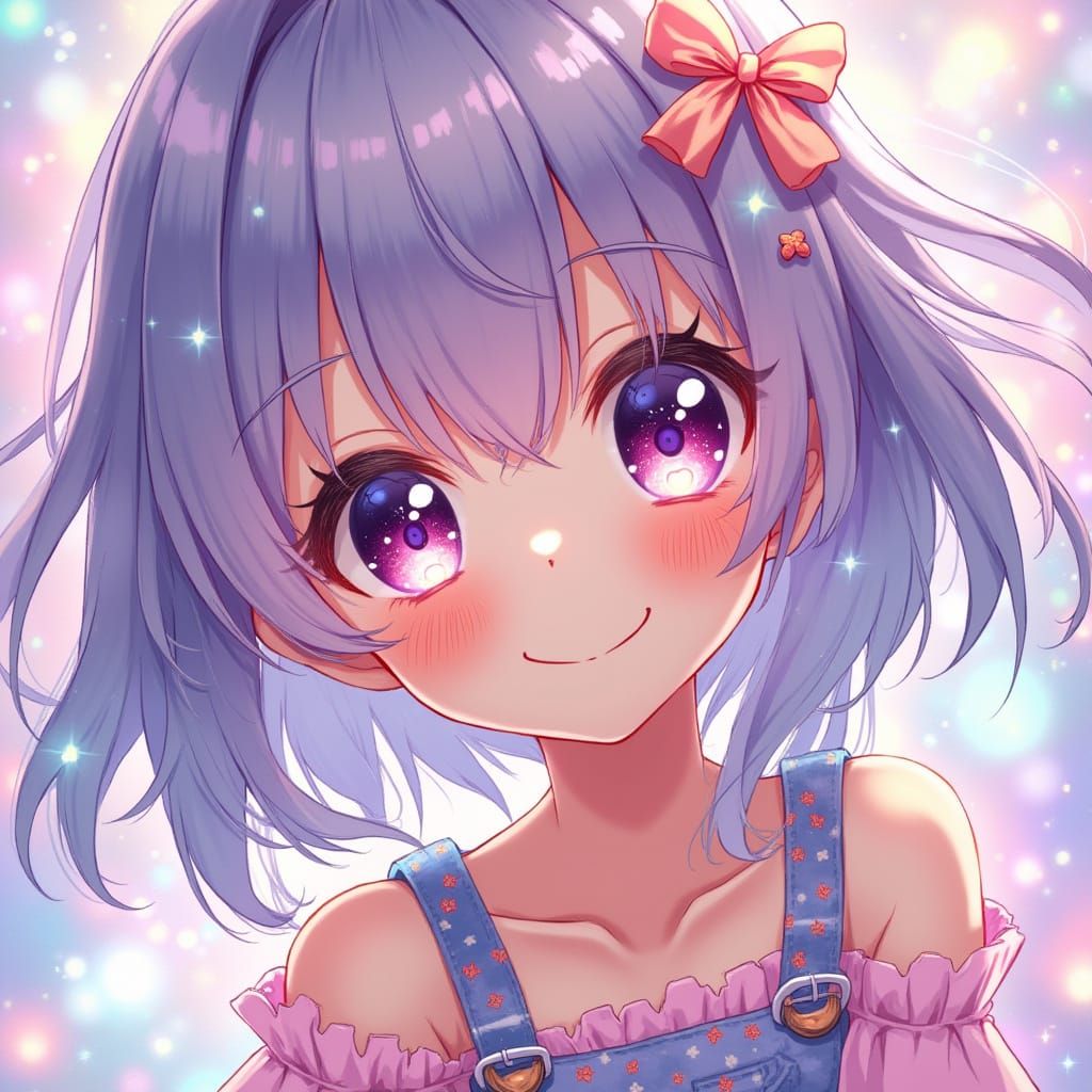This image showcases a young anime girl surrounded by a kaleidoscope of pastel hues, evoking the kawaii style of modern Japanese pop culture. Her sparkling eyes and playful gaze capture the viewer's attention, embodying the carefree spirit of youth.