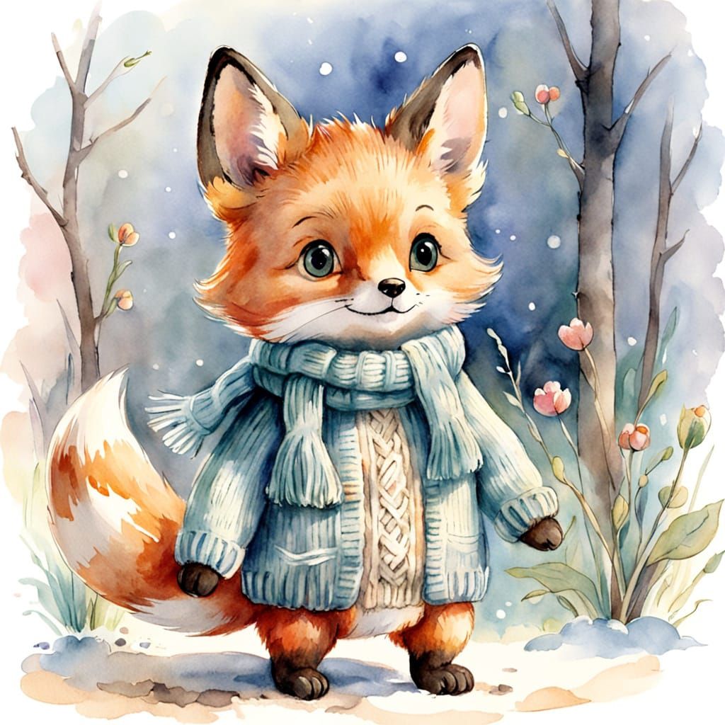 A whimsical watercolor sketch of a toy fox cub wearing a knitted sweater and scarf. This charming artwork features soft brushstrokes and muted pastel colors, creating a cozy, festive winter scene.