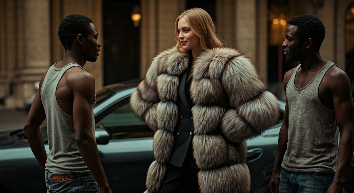 A young French aristocrat and Nigerian migrants share a moment of camaraderie and shared joy on a picturesque Parisian street, surrounded by the grandeur of Haussmann's architecture and the warmth of soft, daytime light.