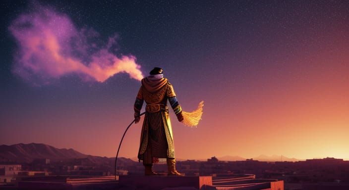 A powerful cinematic illustration of a young Moroccan man standing alone on a dusty rooftop at twilight, wearing a modern djellaba with Gnawa patterns and a hood partially covering his face, eyes burning with silent resistance. Around him, fragments of lyrics float like glowing digital calligraphy in the air. The background shows a vast urban cityscape blending ancient Moroccan architecture with dystopian futuristic elements. Floating Gnawa instruments like qraqeb and guembri glow with electric energy. The sky is deep purple with streaks of burning orange, symbolizing struggle and hope. Volumetric lighting, strong shadows, sharp focus on the character, emotional tension, 16:9 aspect ratio, cinematic color grading, dramatic atmosphere, lo-fi textures mixed with subtle glitch effects.
