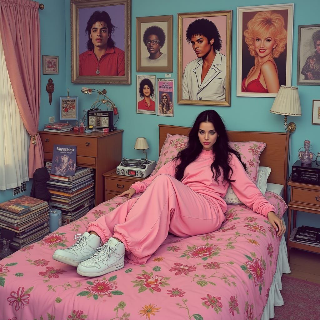 This nostalgic illustration depicts a woman waking up in a vibrant 1980s bedroom, surrounded by iconic posters, cassette tapes, and radical patterns, in a retro-futuristic style reminiscent of sci-fi classics.