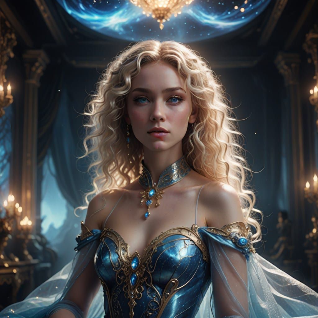 This image showcases a tall, glamorous Pleiadian woman with blonde curly hair and blue eyes, set against a cosmic backdrop. The scene is a high-fashion, dreamlike studio photograph with ethereal soft lighting and avant-garde attire.