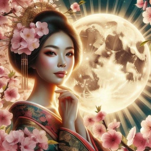 Generate your own beautiful oriental woman images with cherry blossoms and moonlight, easily and for free