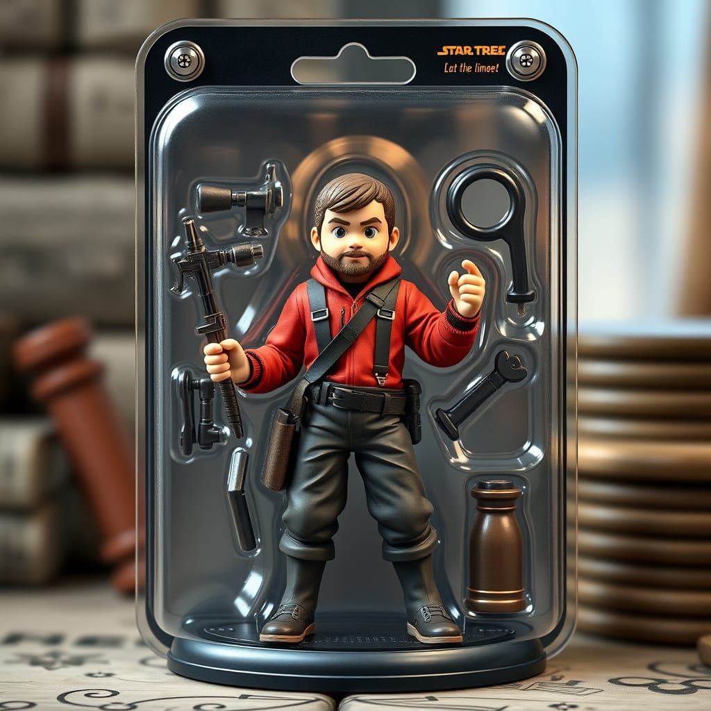 This image showcases a figurine of a skilled building worker packaged in a detailed blister pack, complete with accessories and cinematic lighting, in a style reminiscent of Studio Trigger's anime artwork.