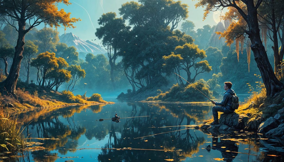 This digital painting captures a young man fishing by a lake, surrounded by trees and bushes on a sunny day. It features vibrant colors and ethereal lighting, inspired by surrealism and futuristic landscapes.