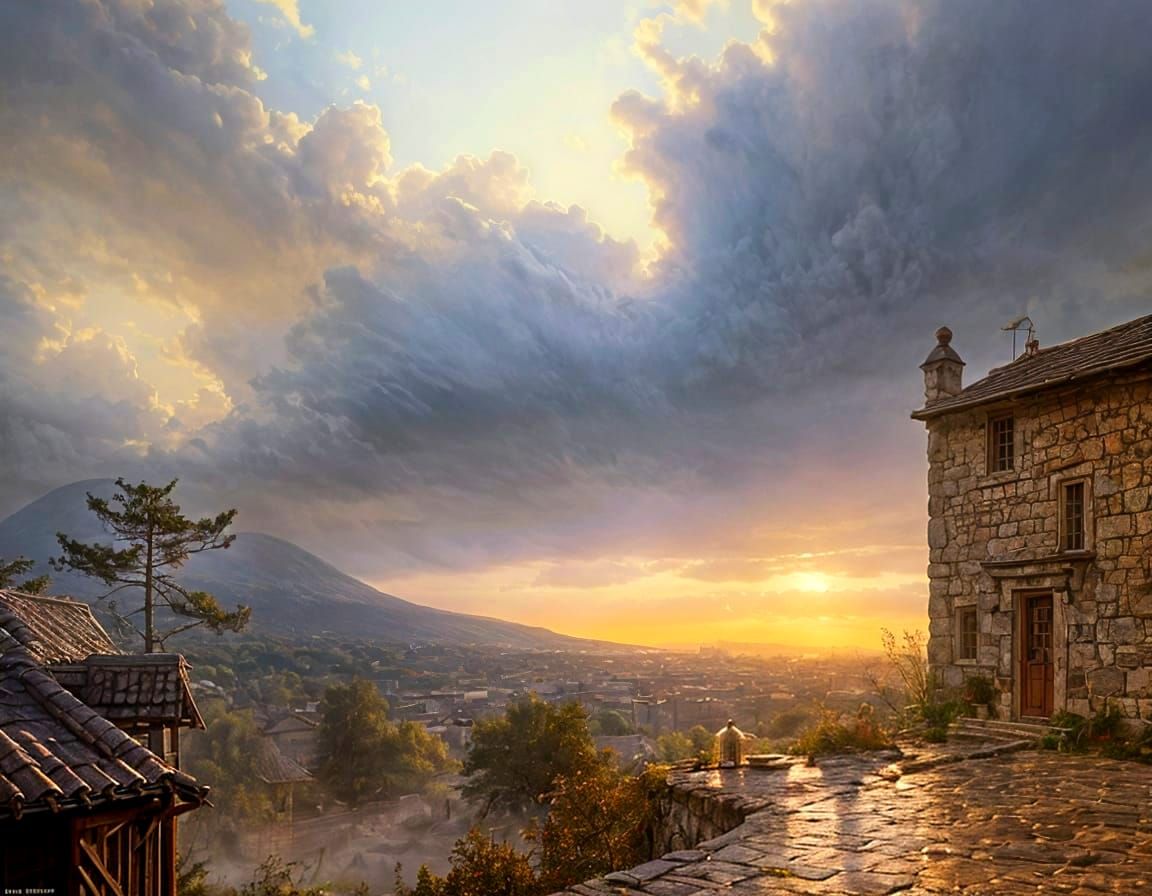 This enchanting watercolor painting captures a steaming cup of coffee on a rustic stone wall, set amidst a fairytale landscape of thatched roofs and a breathtaking sunset. The artwork features intricate textures and rough brushstrokes, evoking a sense of fine art drama and beauty.