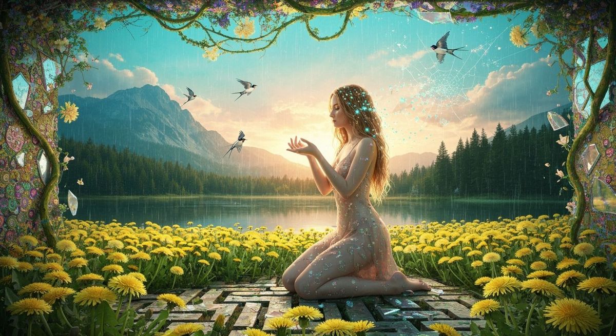 A mystical woman wanders a labyrinth of light, glowing flora, and shattered mirrors on a rainy autumn sunset. Inspired by surrealist and expressionist art, rendered in 8K with iridescent patterns.
