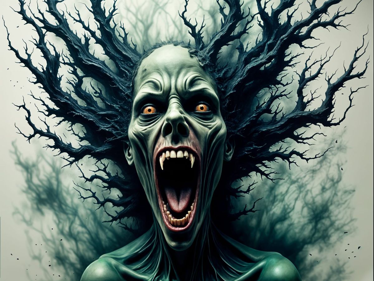 This image features a frightening, intricately detailed inkblot monster portrait with dramatic lighting and deep colors. It resembles a disturbing oil painting with fluid ink and smoke art elements.