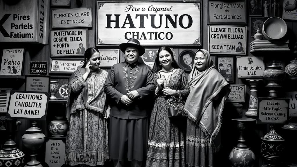 This striking image showcases a family embracing their cultural traditions in a vibrant, black and white film noir-inspired artwork, highlighting the richness of bilingual heritage and identity.