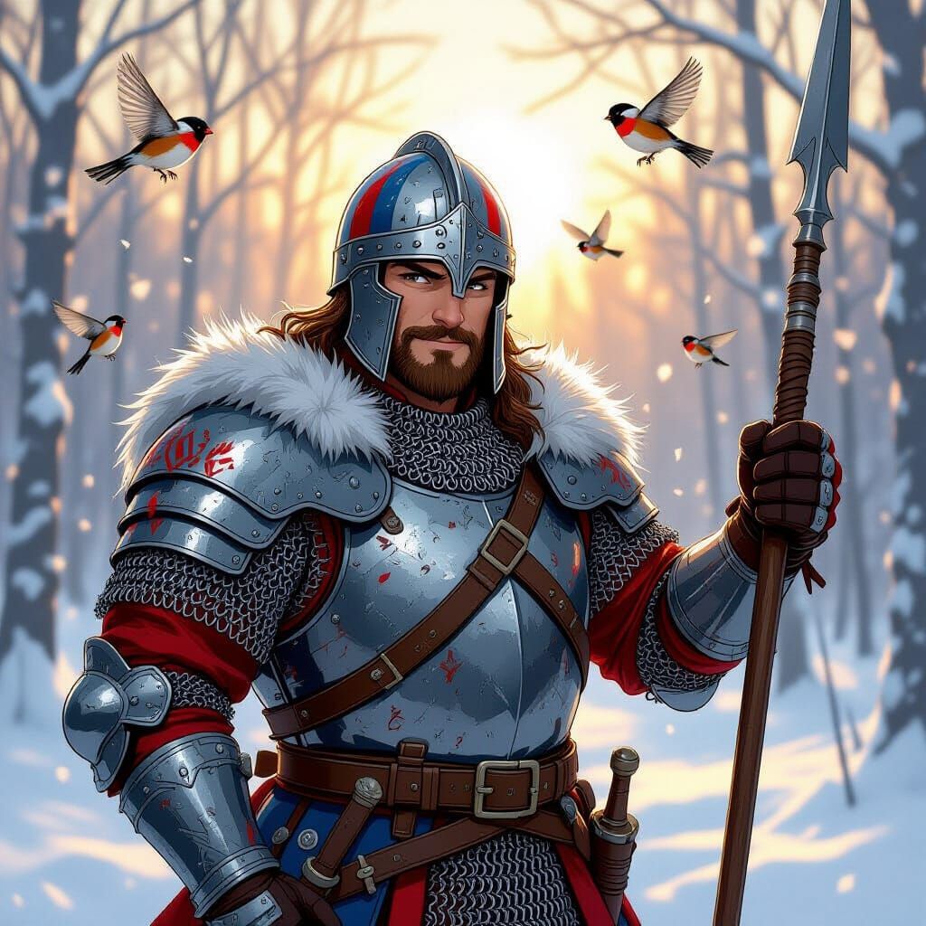 This anime-style comic book art features a smiling Russian warrior in striped chainmail, leaning on a spear in a winter forest. Early morning sun creates a glitter effect around him and flying bullfinches.