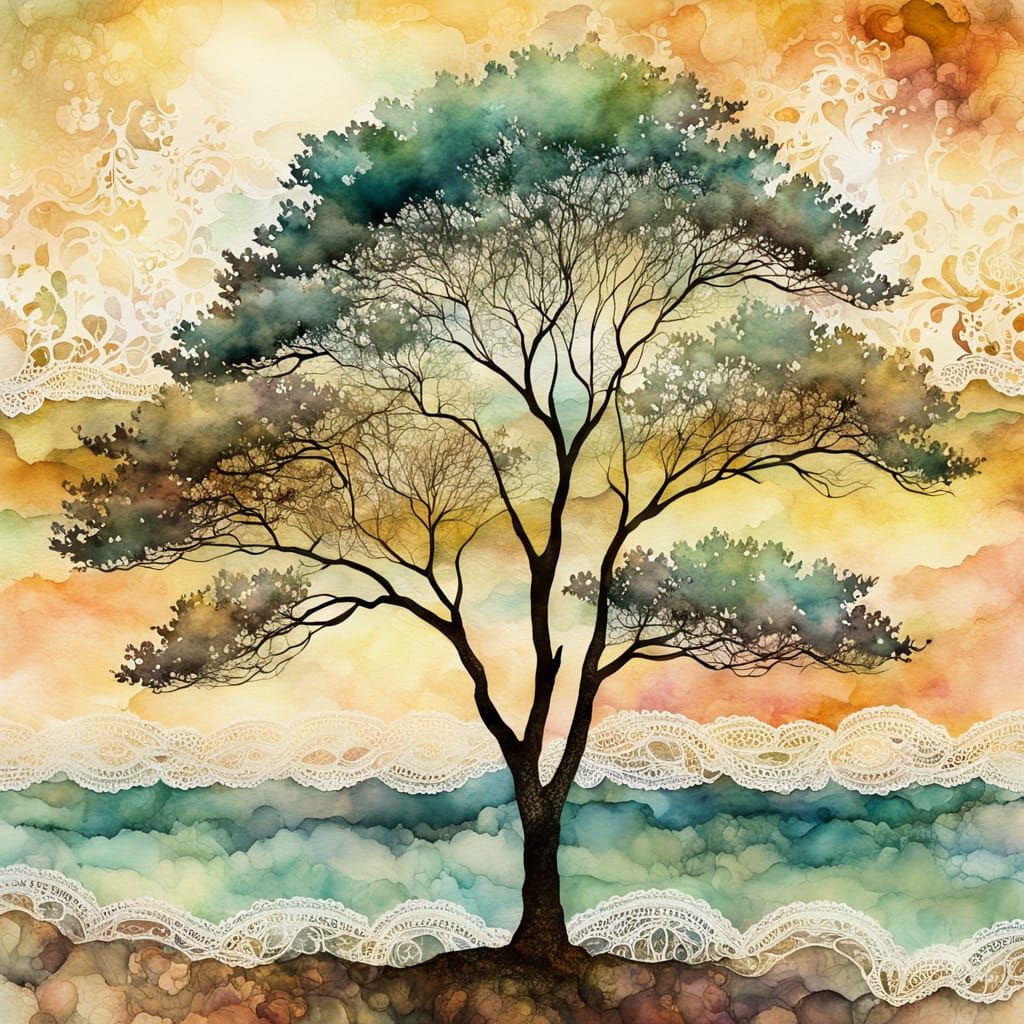 A mixed media collage of a lone tree on a shore at sunset. The artwork features delicate lace details, iridescent gold accents, and a vintage, aged paper texture in watercolor and alcohol ink style.