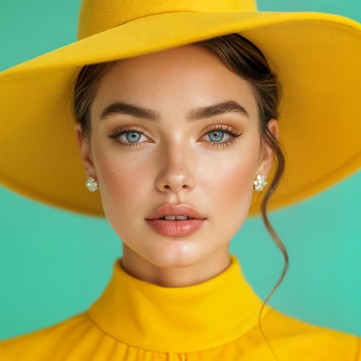 A stunning close-up of a young woman with striking blue eyes and a bright yellow hat. This ultra-sharp fashion portrait features a flawless complexion and vibrant colors.