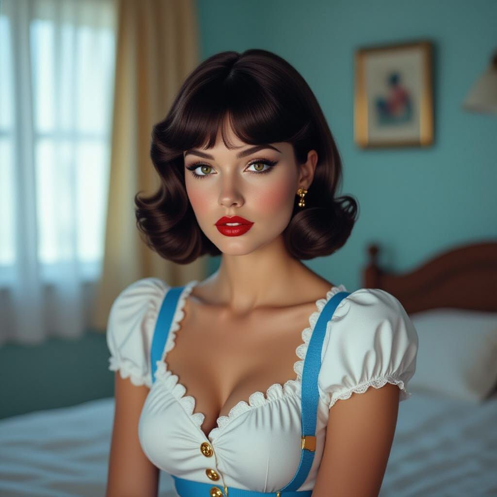 This image shows a striking androgynous woman with dark hair and hazel eyes in a 1950s pin-up style. She is wearing a white top with blue and gold details in a softly lit bedroom, rendered as a film still.