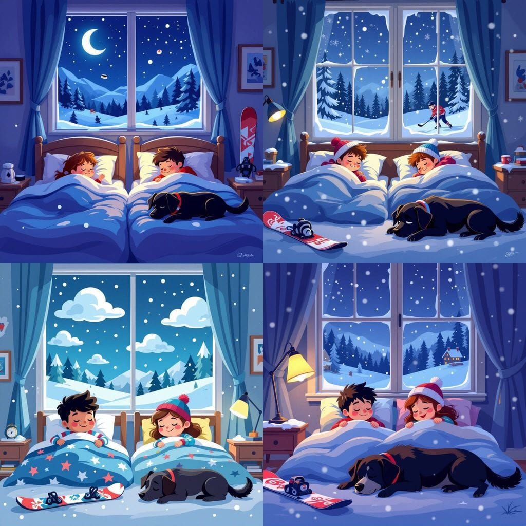 This charming cartoon depicts children and a black lab sleeping soundly, dreaming of exciting ice hockey escapades. Snow falls outside their window, adding a whimsical touch to their slumber.