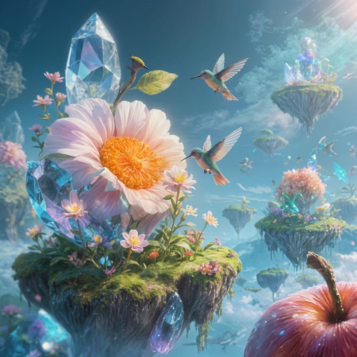 This image depicts a surreal landscape where giant crystal fruits create floating islands. Tiny, shimmering hummingbirds gather nectar from glowing flowers in this vibrant, enchanted scene.