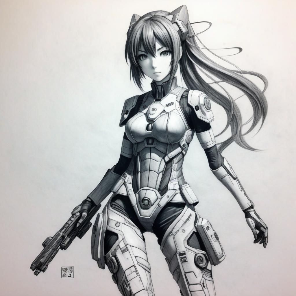 This image shows a full-body view of a science fiction anime girl. The hyperdetailed drawing is rendered in a charcoal style.