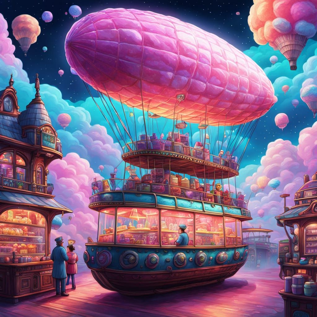 A vibrant, dreamlike image of a cotton candy shop on an airship. The shopkeeper serves treats amidst iridescent clouds and glowing neon lights. The image is a surreal astral illustration with soft pastel colors.