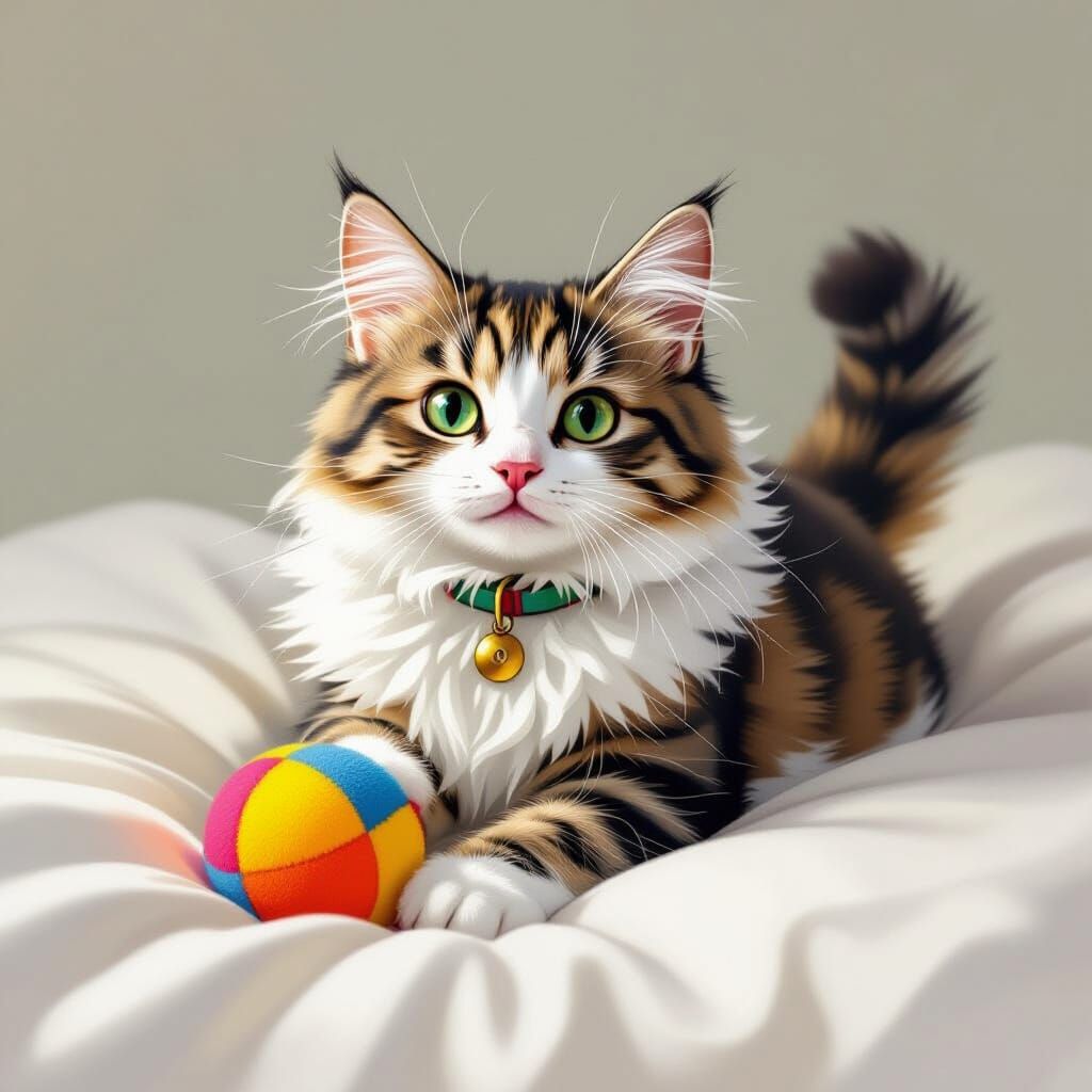 This image shows an adorable cat wearing a fluffy collar and playing with a colorful ball on a soft, white bed. The image is in a whimsical, cartoonish style.