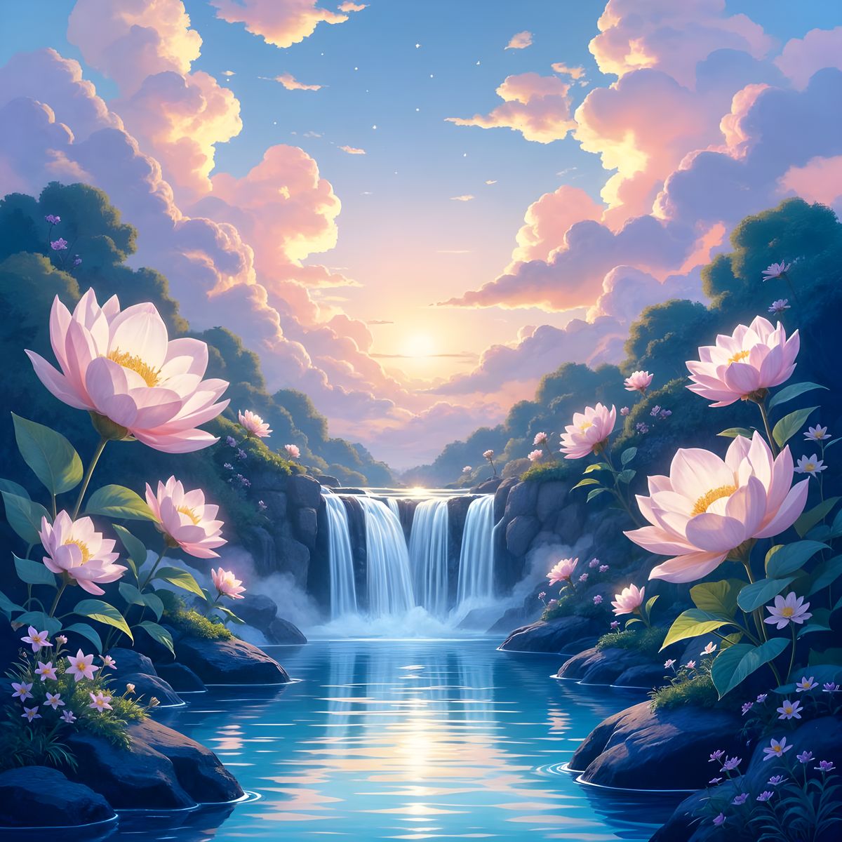 This image shows a magical garden with large, luminous flowers beneath swirling pastel clouds. A shimmering waterfall flows into a clear pool, creating a tranquil scene in a fantasy art style.