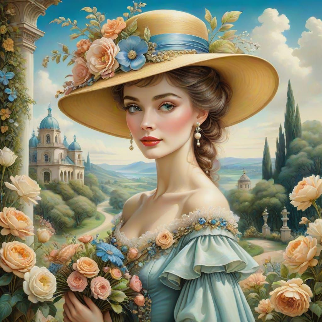 This portrait captures a refined young woman from the 18th century, adorned in a fashionable dress with intricate details and standing amidst a lush garden backdrop.