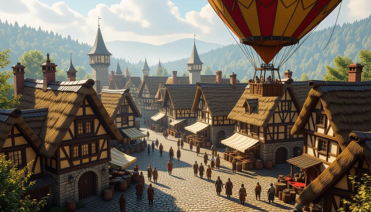 A picturesque medieval village as seen from above. The vibrant fantasy scene includes detailed cottages, bustling marketplaces, and a diverse population in warm, earthy tones. The image is rendered as a high-fantasy matte painting.