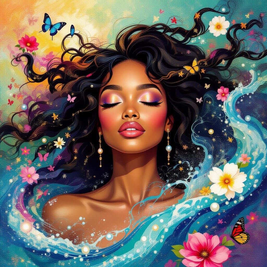 This digital painting features a beautiful African American woman with closed eyes, her skin glowing. Her hair flows into colorful rivers with flowers, pearls, and butterflies, creating a surreal, dreamlike scene.