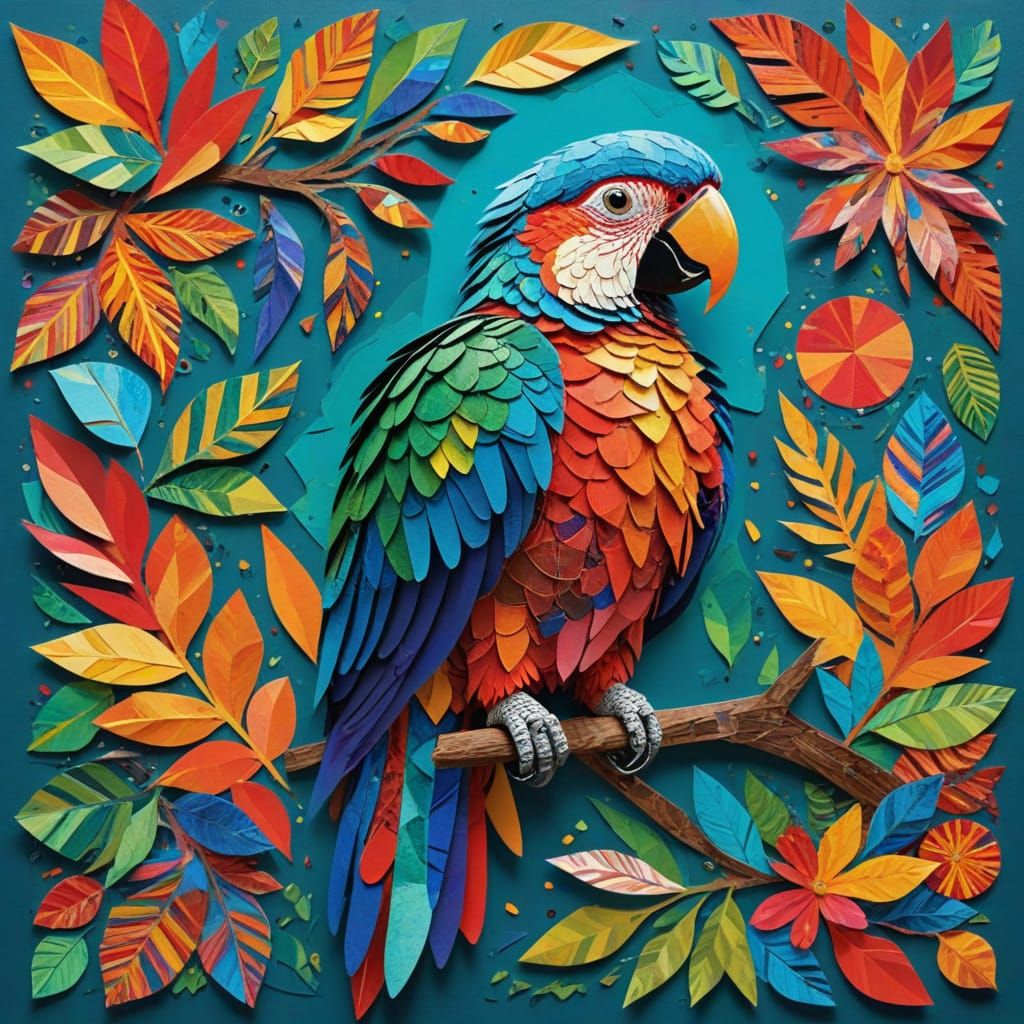 This image is a cheerful paper collage depicting a parrot. It features overlapping layers of textured, colorful paper scraps, creating a whimsical and decorative mosaic effect.